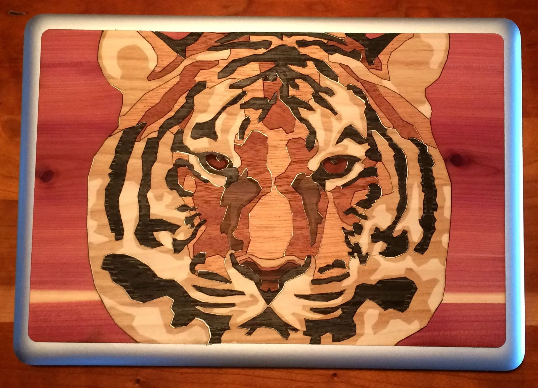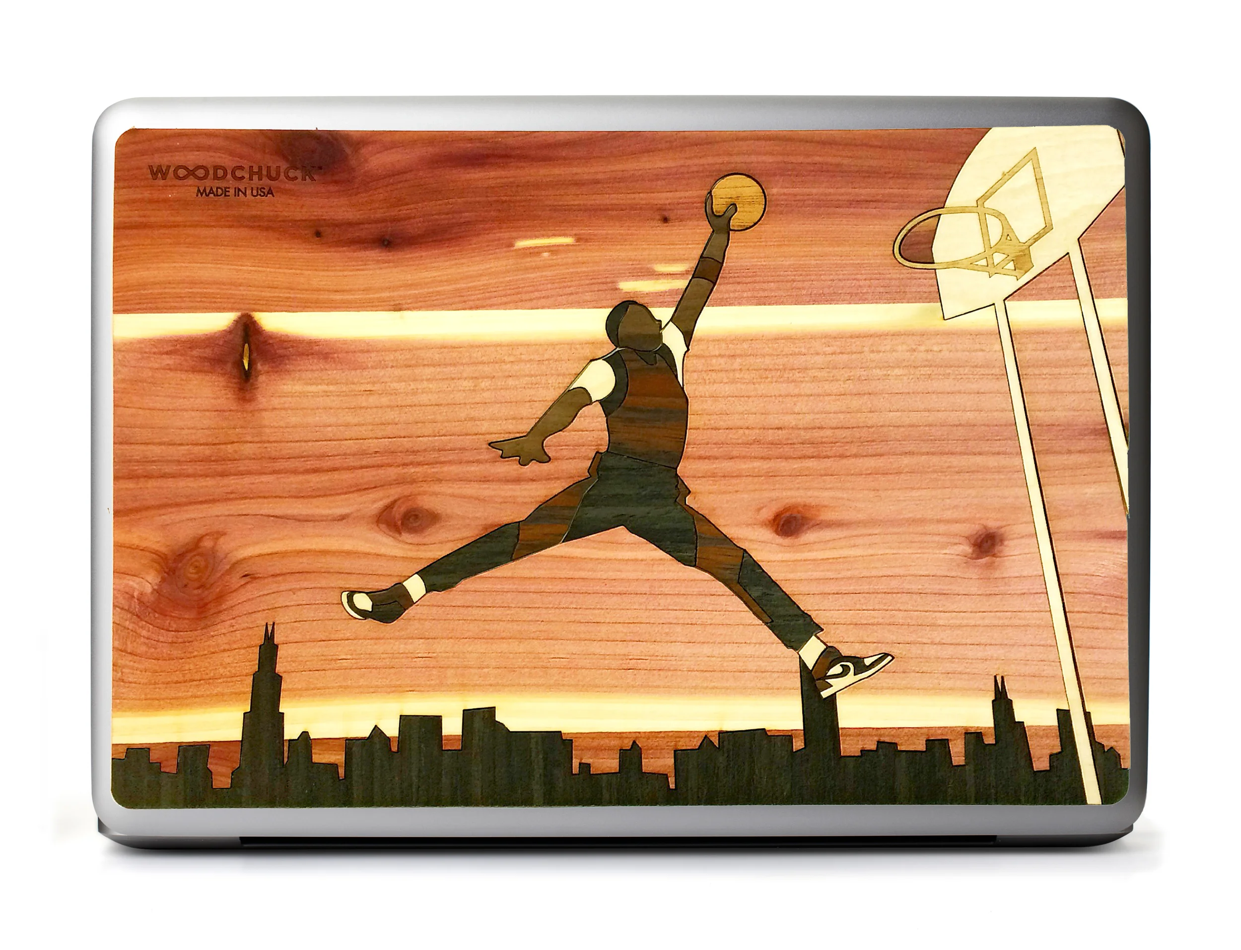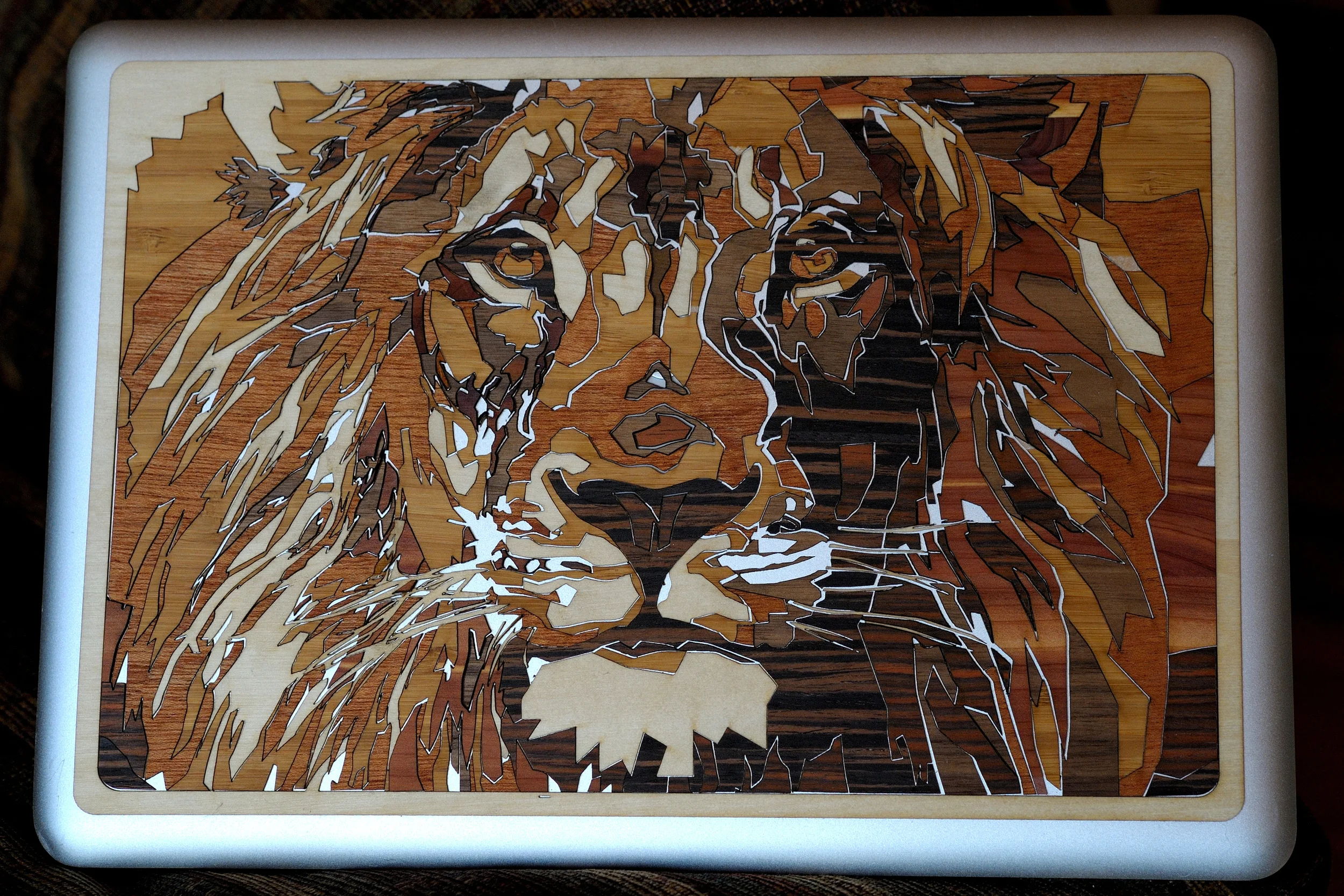 Laser cut laptop skin made from seven different wood species. Photograph was modified and designed in Adobe Illustrator.